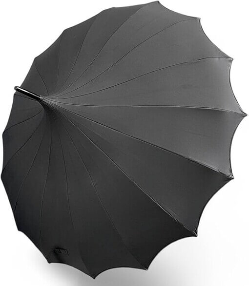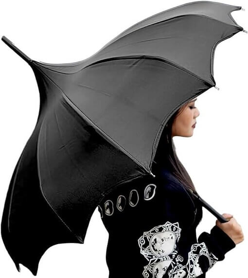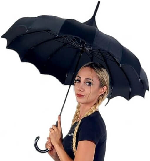 Picture a bat in flight under the tempestuous sky – that’s the striking vision this gothic pagoda umbrella evokes with its scalloped edges reminiscent of a bat’s wings. Crafted for those who dare to stand out, this manual open umbrella is not only a conversation starter but a fortress against the weather. Windproof and waterproof, it offers ultimate protection on stormy days, while its UV-blocking capabilities ensure you remain unscathed by the sun’s harsh gaze.
